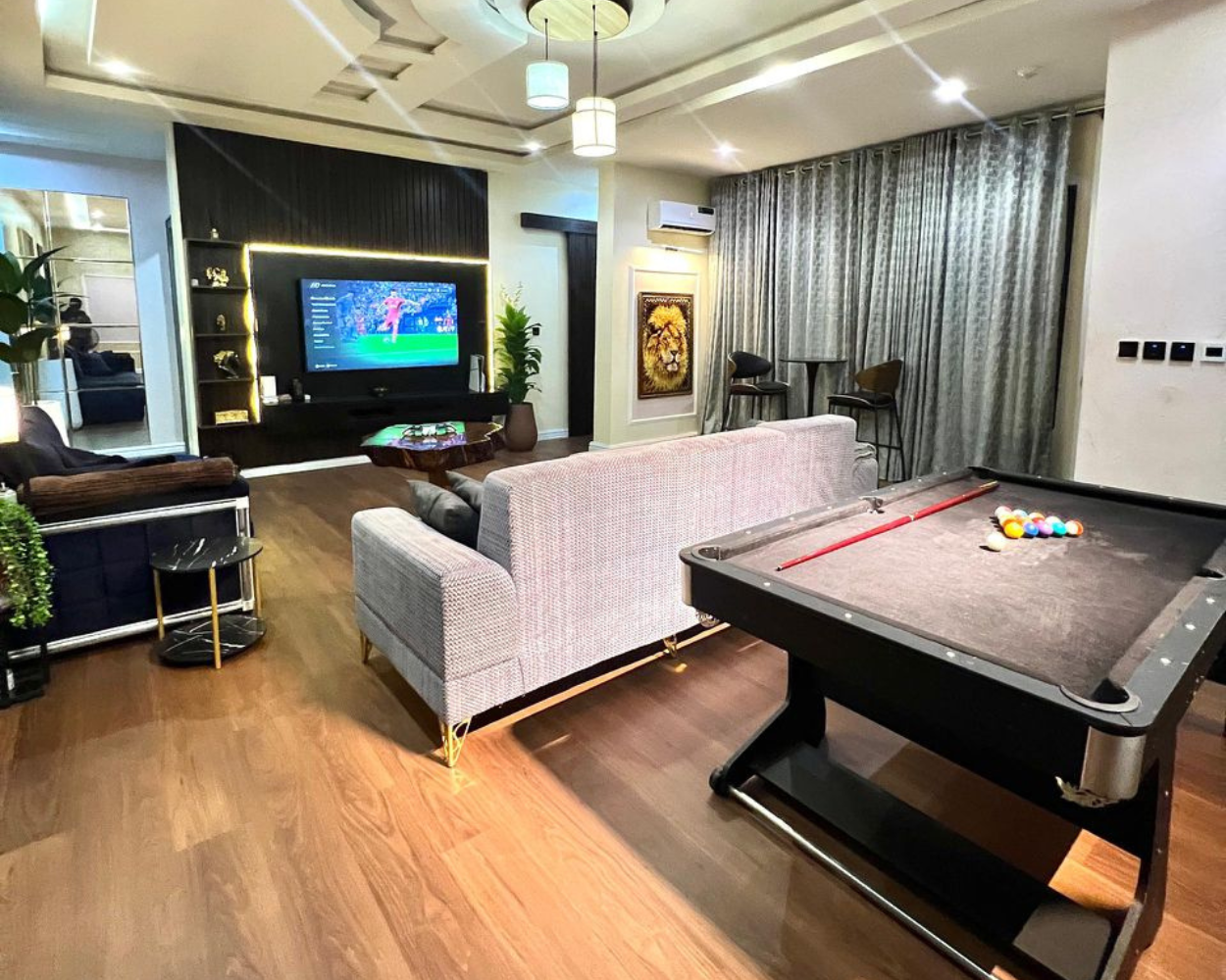 This is a 3 bedroom in the heart of the Abuja , with good road network and modern day interior decoration and facility for your leisures ,such as pool table , dstv/netflix , uninterupted power supply 5G unlimited unterupted internet and a body therapist on appointments The apartment is also equipped with CCTV security camera for your safety and ample parking space. It is located close to shopping malls, government offices and other amenities.It is located in a safe neighborhood with 24-hour security. It is a perfect place for a comfortable and relaxing stay.
